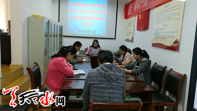 天天天水网讯(通讯员汪文惠)为进一步推进“转变工作作风严明工作纪律改善发展环境建设年”活动深入开展,5月11日上午,天水郡街道西十里社区召开了“转变工作作风严明工作纪律改善发展环境建设年”活动工作会。社区党总支班子成员、全体社区干部职工共11人参加。会议由社区党总支书记汪文惠主持。