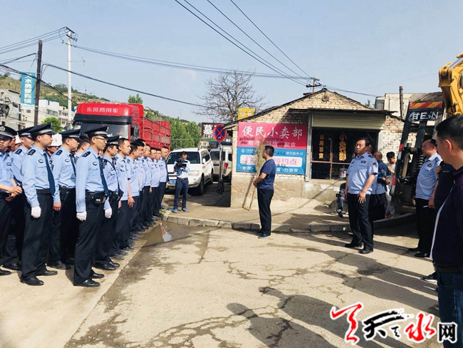 为了坚决制止偷建抢建行为,5月17日上午,由秦州区政府组织召开专项整治会议,成立了由区执法局、区国土局、玉泉镇、区公安局及大城街道办事处等相关责任单位80余人组成联合执法队伍,在专业拆除工人的配合下,对正在抢建的4处违章建筑进行了先期拆除,拆除面积240余平方米,有力地打击了偷建抢建行为。