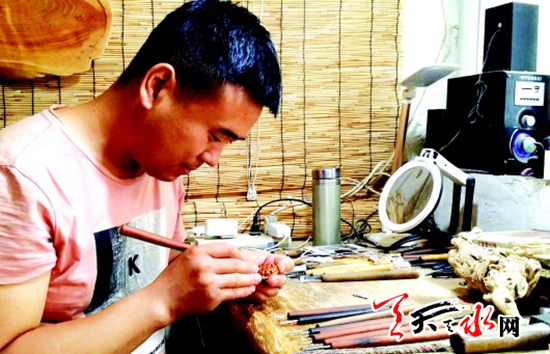 今年34岁的移卫军,是甘谷县大像山镇土堆村人,在从事桃核雕刻之前,他已经从事木雕工作10多年了。正是从事木雕工作多年磨练出来的扎实功底,给他的桃核雕刻设计搭出了创造创新的新舞台。