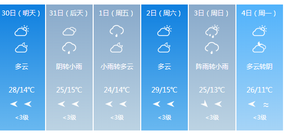 预计5月28日至30日天气以多云为主,31日多云转小雨,6月1日小雨转多云,2日多云,3日阴。气温预报以秦州区为例,日最低气温11~16℃,日最高气温24~28℃,日平均气温19~21℃。