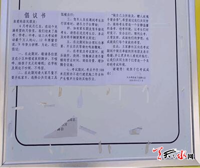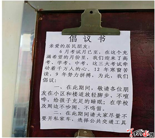 天天天水网讯(通讯员 吴娟)十年寒窗磨利剑,六月沙场试锋芒。又是一年高考季,为了给广大考生营造安静舒适的应考环境,6月5日上午,王家磨社区在辖区范围内张贴了王家磨社区高考温馨提示倡议书,向广大居民倡议: