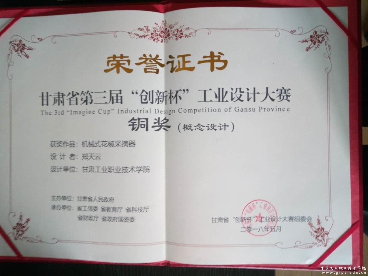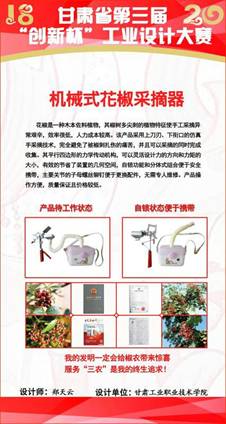 甘肃省第三届“创新杯”工业设计比赛由省人民政府主办,省工信委、省教育厅、省科技厅、省财政厅、省政府国资委协办。分“产品设计组”和“概念作品设计组”两个组,其中“产品设计组”参赛产品900多个,设金奖10名,银奖10名,铜奖10名,优秀奖70名。“概念作品设计组”参赛作品300多个,设金奖10名,银奖10名,铜奖10名。我校电信学院郑天云副教授设计的“机械式花椒采摘器” 荣获“概念作品设计组”铜奖;电信学院金佛荣老师设计的SMN-1低压开关柜触头夹紧力检测仪获“产品设计组”优秀奖。