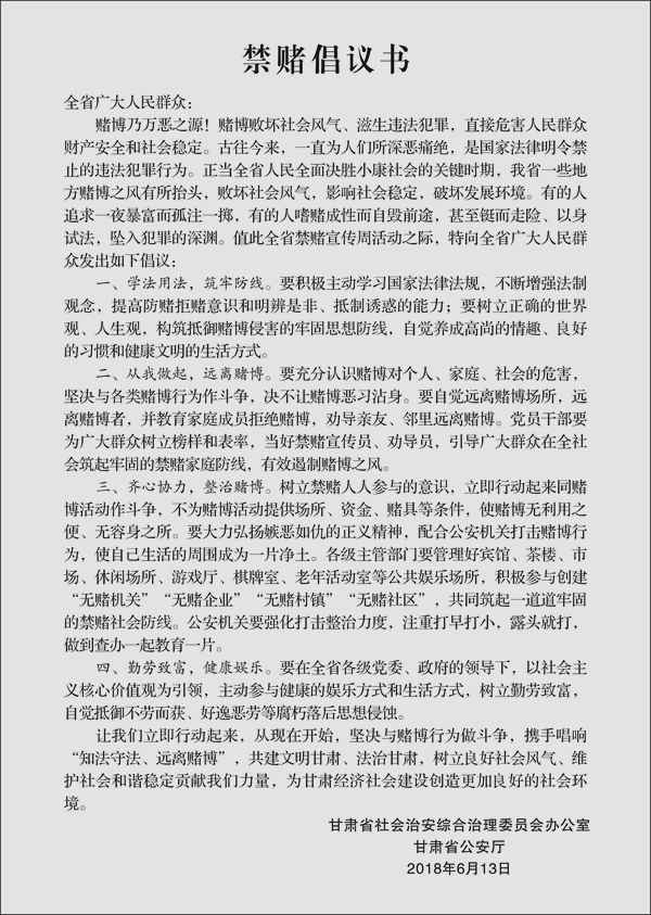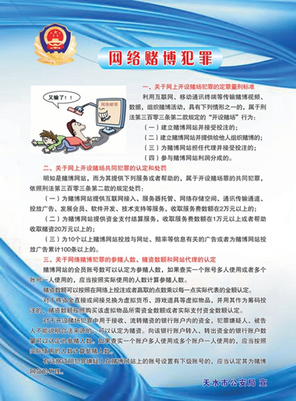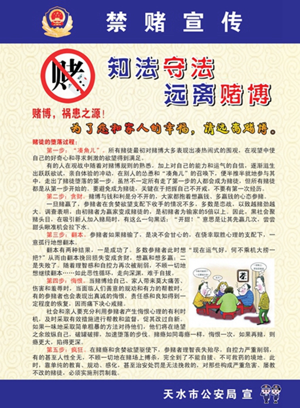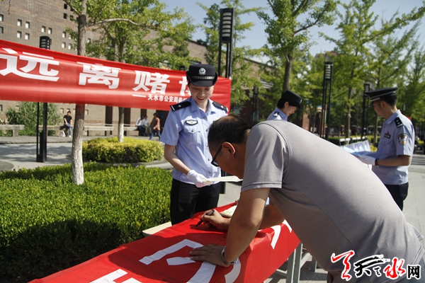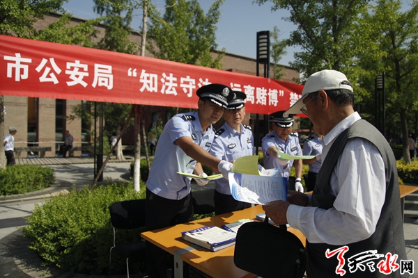 天天天水网讯(通讯员王世强) 为贯彻落实习近平总书记等中央领导和公安部领导有关重要指示批示精神,深入打击惩治各类赌博违法犯罪活动,按照甘肃省公安厅统一安排,天水市公安局在全市部署开展了为期一周的“知法守法、远离赌博”禁赌主题宣传活动。