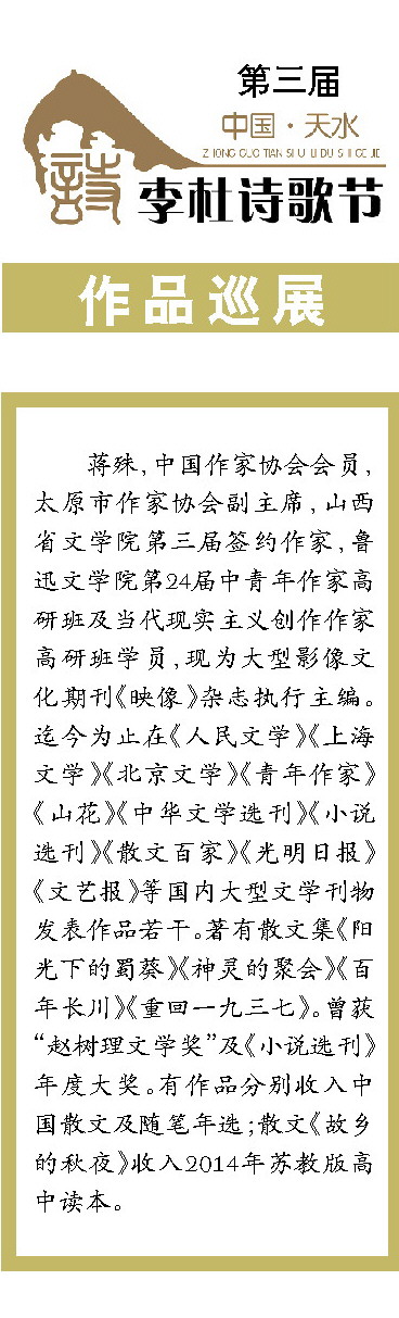 蒋殊,中国作家协会会员,太原市作家协会副主席,山西省文学院第三届签约作家,鲁迅文学院第24届中青年作家高研班及当代现实主义创作作家高研班学员,现为大型影像文化期刊《映像》杂志执行主编。迄今为止在《人民文学》《上海文学》《北京文学》《青年作家》《山花》《中华文学选刊》《小说选刊》《散文百家》《光明日报》《文艺报》等国内大型文学刊物发表作品若干。著有散文集《阳光下的蜀葵》《神灵的聚会》《百年长川》《重回一九三七》。曾获“赵树理文学奖”及《小说选刊》年度大奖。有作品分别收入中国散文及随笔年选;散文《故乡的秋夜》收入2014年苏教版高中读本。