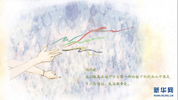 妈妈说,五彩绳要在端午节后第一场雨摘下扔到雨水中漂走,可以将烦恼、疾病都带走。