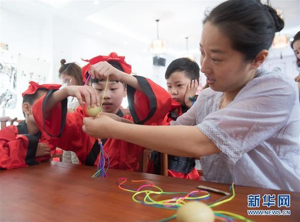 6月17日,楼家村的孩子和家长在文化礼堂一起编蛋袋。当日,浙江省诸暨市枫桥镇楼家村举行活动,孩子们学习包粽子、做麦花、编蛋袋等传统习俗,迎接端午节。新华社记者翁忻旸摄