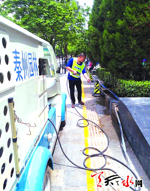6月21日,在秦州区藉河南路正在浇水的秦州区园林处绿化管护二队队长张岳告诉记者,他负责从南大桥到东桥头这一大块区域的美化绿化工作。“为了装扮节会的秦州,我们队从6月5日开始集中布置花卉,营造景观亮点。”他一边说一边给绿化带浇水,汗水顺着脸颊往下流,他也顾不上擦拭。
