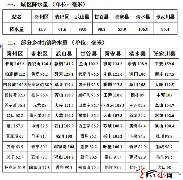 天天天水网讯 受冷空气和西南暖湿气流影响,24日凌晨至25日夜间,我市出现大范围暴雨天气,全市共有197个雨量点出现暴雨(≥50毫米),其中35个监测点雨量超过100毫米,最大降水量出现在秦州区娘娘坝镇长河,达162.6毫米。24日00时至26日07时降雨量统计如下: