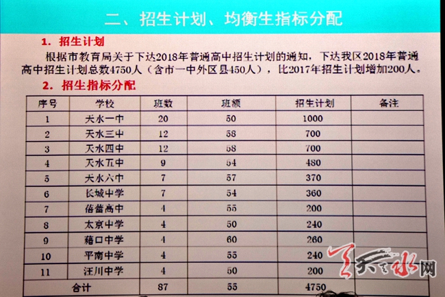据介绍,秦州区2018年市教育局下达高中招生计划为4750人,其中,市一中本部招生1000人(秦州区550人,外县招生450人),秦州区区属高中计划招生3750人。与往年相比,秦州区今年重新规范了普通高中录取顺序,依次为天水一中(省级示范性高中)、天水三中(市级示范性高中)、天水四中(市级示范性高中)、天水五中、天水六中、长城中学、农村高中及蓓蕾高中。录取中,将严格按照考生所报志愿,优先从第一志愿进行录取,如果第一志愿滑档,再从第二志愿进行录取,若考生所报志愿全部滑档,将严格按秦州区普通高中录取顺序录取。如:考生所报第一志愿为天水一中、第二志愿为天水三中,两个志愿同时滑档,将按天水四中、天水五中、天水六中、长城中学、农村高中及蓓蕾高中的顺序录取。