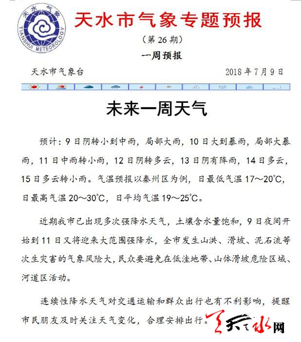 来源: 天水市气象台    编辑: 姚宇 2018-07-09 14:39:25 星期一     字体设置: