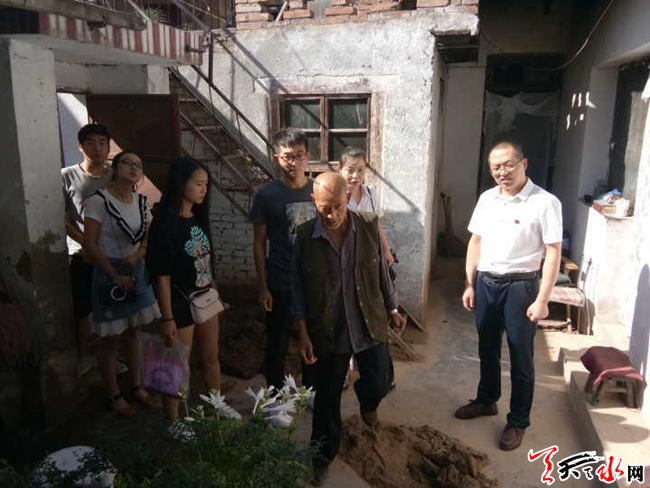 在活动中,社区工作人员带领大学生们来到辖区因暴雨影响,受灾严重的上庵沟102号吴莲生、104号马晓东家里,查看了房屋受灾情况,看望了受灾居民,并对他们进行了安全知识宣传。随后,带领大学生来到辖区巷道,对临街门店、辖区居民进行了环保宣传,希望引起周边居民以及社会各界的关注,倡导大家共同努力,营造人人环保的氛围。