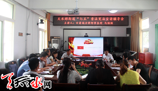 天天天水网讯(通讯员任勇)为进一步深化对新修订《中华人民共和国宪法》的学习宣传和贯彻实施,不断增强街道领导干部的宪法意识,从而形成在全辖区尊崇宪法、学习宪法、遵守宪法、维护宪法、运用宪法的浓厚氛围。全面实施“法律八进”宣传活动,推进街道“七五”普法工作。8月3日上午,天水郡街道邀请到甘肃端方律师事务所马强强律师开展新修订“宪法”法治讲座。街道班子成员、干部职工等共60余人参加。