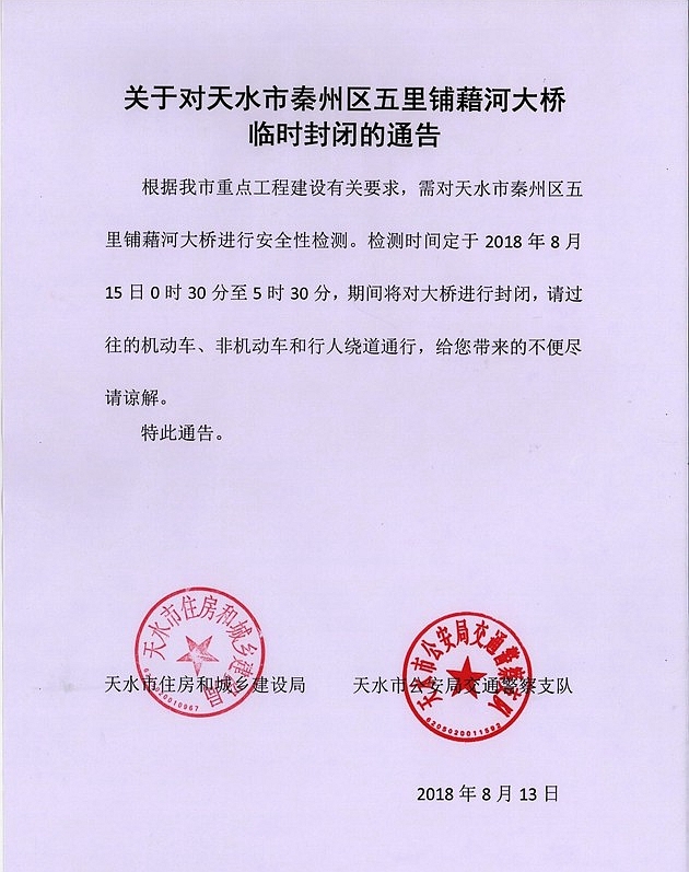 关于对天水市秦州区五里铺藉河大桥临时封闭的通告