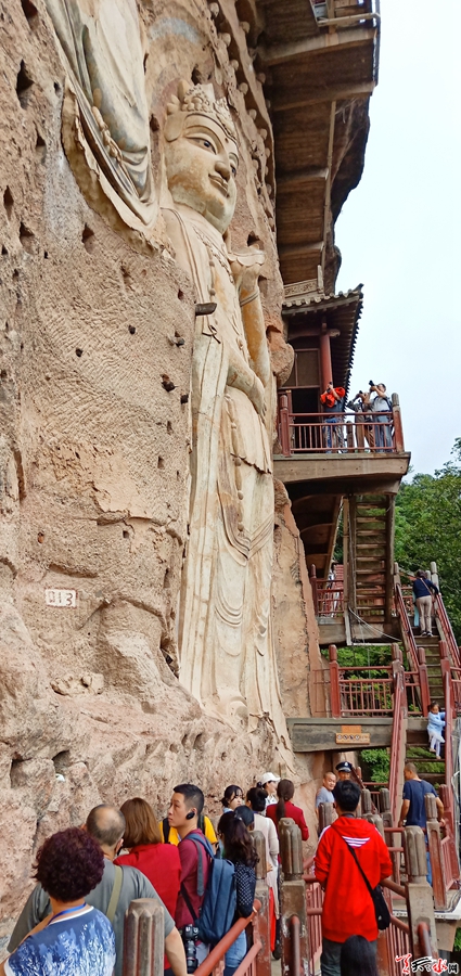 在秋雨霏霏的麦积山石窟,山岚缭绕、烟雨蒙蒙,麦积奇峰时隐时现,呈现出“麦积烟雨”之奇观。站在造型各异、神态逼真的雕塑前,采风团成员不由得发出感叹。86岁高龄的著名诗歌评论家、第三届李杜诗歌奖贡献奖获得者谢冕虽是第二次来到麦积山石窟,但依然兴致勃勃地登上了石窟,认真听取讲解,在塑像前驻足凝视,又一次感受麦积山独特的艺术之美。