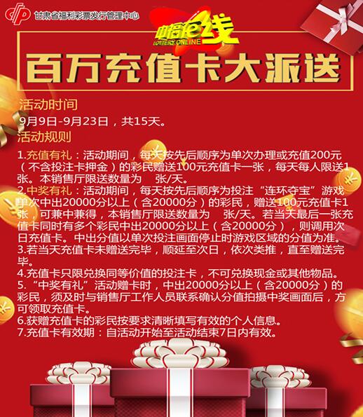9月9日起,凡在全省任意销售厅单次办理或充值200元或“连环夺宝”游戏单次中出20000分以上(含20000分)的彩民,均有机会获得100元充值卡一张。福彩陪您过金秋,快来中福在线投注吧,充值卡有限,先到先得哦!