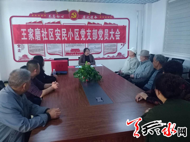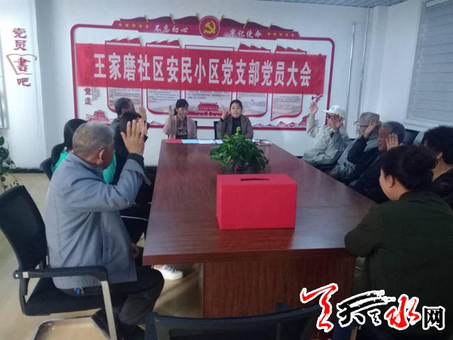 天天天水网讯(通讯员吴娟)为进一步发挥党组织的战斗堡垒作用和党员先锋模范作用,密切联系群众,把党的路线方针政策传达好、贯彻好、落实好,更好的服务居民群众,王家磨社区党委按照上级党组织的安排和有关文件精神,并经天水郡街道办事处党工委同意,成立了王家磨社区安民小区党支部。