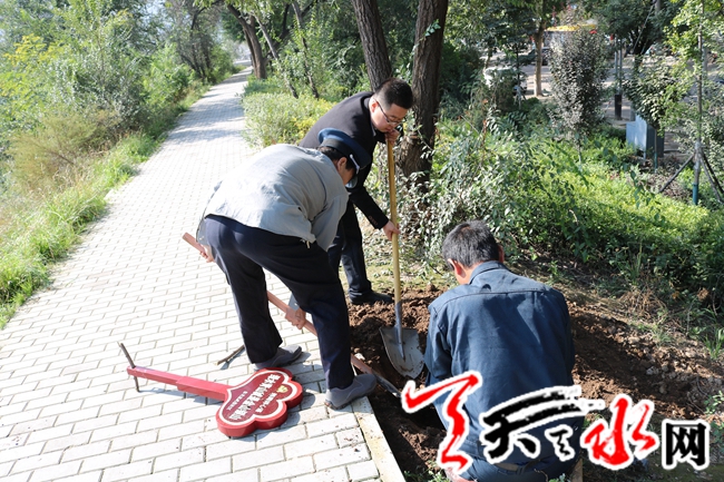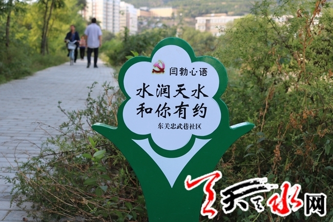 10月6日,在罗玉河堤上,社区党员志愿者将一块块书写着“绿水青山,就是金山银山”、“呵护生态环境,善待生命之源”、“水润天水,和你有约”党员心语的牌子,立在社区在职党员负责的区域内,善意地提醒居民不要向河道内乱扔垃圾,乱排污水,以促进河长制的落实,防治水污染。