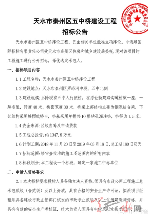 天天天水网讯 10月17日,天水市秦州区五中桥建设工程招标公告发布,该工程已由相关单位批准立项建设。中海建国际招标有限责任公司受天水市秦州区住房和城乡建设局委托,现对该项目的工程施工进行公开招标,择优选定承包人。