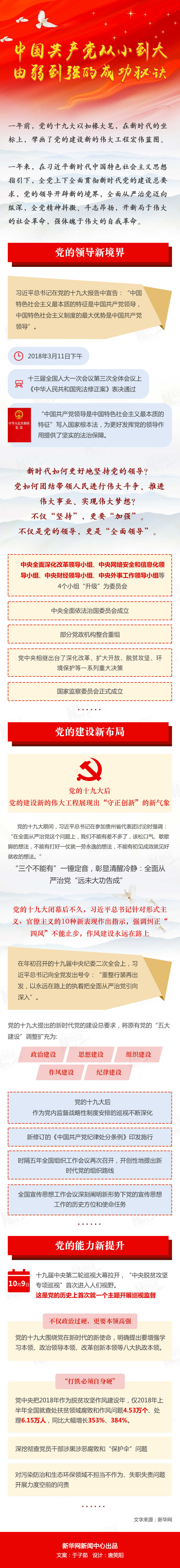 一年来,在习近平新时代中国特色社会主义思想指引下,全党上下全面贯彻新时代党的建设总要求,党的领导开辟新的境界,全面从严治党迈向纵深,全党精神抖擞、斗志昂扬,开新局于伟大的社会革命,强体魄于伟大的自我革命。