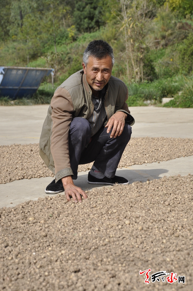 见到赵云峰是在秦亭镇赵尧村新建成的文化广场上,他用手扶拖拉机拉着一车刚刚买来的半夏籽种,在广场上凉晒。