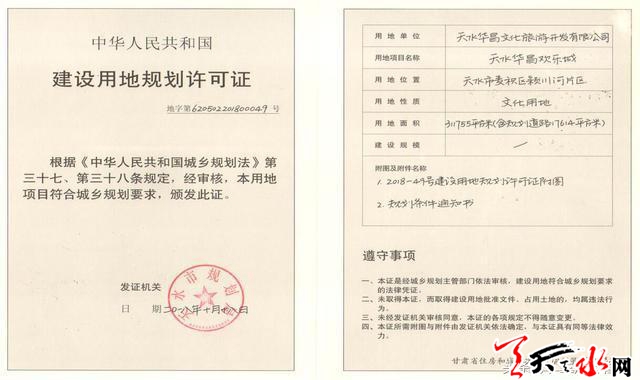 近日,天水市规划局发布了关于天水华昌欢乐城的建设用地规划许可证,根据公告了解到该项目位于天水市麦积区颖川河片区,主要用于文化用地,用地单位为天水华昌文化旅游开发有限公司,占地面积311755平方米(含规划道路17614平方米)。