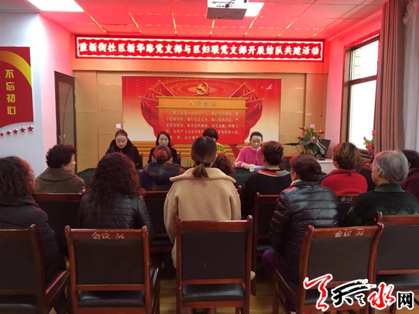 天天天水网讯(通讯员 刘芸芳)为认真贯彻落实区委关于加强基层党组织建设的决策部署,推动基层党建共同进步、共同提高。10月25日上午,中城街道重新街党委和区妇联机关开展结对共建活动。