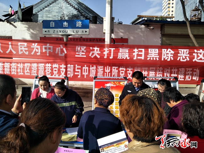 天天天水网讯(通讯员 刘芸芳)为认真贯彻落实全区组织工作会议精神,推动辖区党建共同进步、共同提高。10月25日下午,重新街社区澄源巷党支部联合辖区中城派出所开展“扫黑除恶”专项斗争宣传活动。活动中,社区工作人员和派出所干警联合,通过拉横幅、在明显位置张贴海报以及挨家挨户发放宣传一封信、打黑除恶宣传册和现场咨询等多种形式,为群众宣讲打击黑恶势力的相关内容和举报方式,鼓励引导群众遵守法律法规,积极踊跃揭发检举黑恶势力违法犯罪线索。
