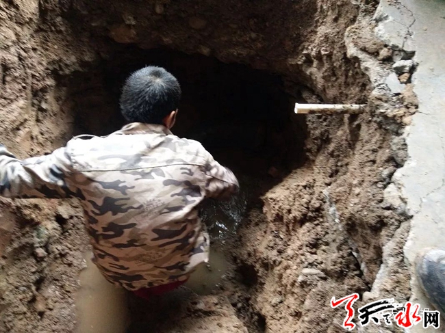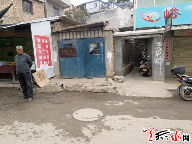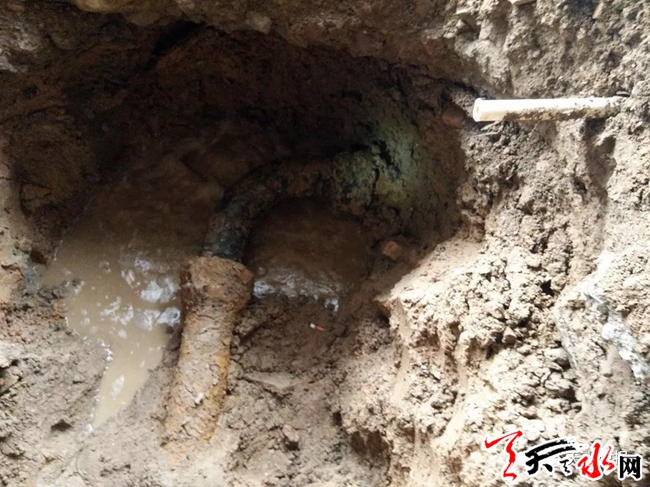 记者看到,在巷道东侧一店铺门前,路面被挖开一个大坑,一名男子正在坑内作业,坑外有几个人在指挥。经询问得知,其中一人是该村管理水站的刘师傅,其他几人是秦州区房管局工程队的工作人员。刘师傅告诉记者,近期停水是上水管道破裂所致。“10月13日供水期间,突然从该店铺门前的地下管道向路面喷水,于是工作人员排查寻找管道破裂处。后经加压测试,位于弯管处的破裂点很快找到了。”