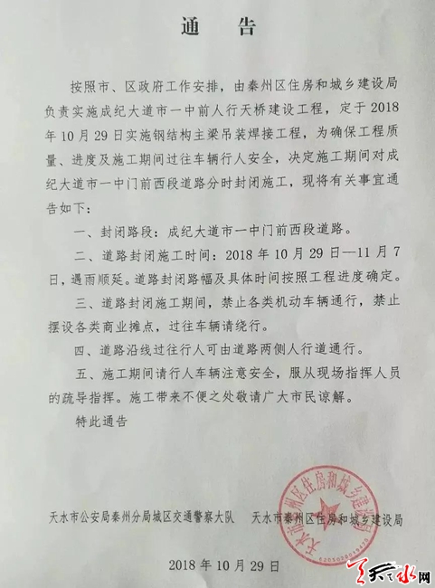 按照市、区政府工作安排,由秦州区住房和城乡建设局负责实施成纪大道市一中前人行天桥建设工程,定于2018年10月29日实施钢结构主梁吊装焊接工程,为确保工程质量、进度及施工期间过往车辆行人安全,决定施工期间对市一中门前南侧机动车道封闭,现将有关事宜通告如下: