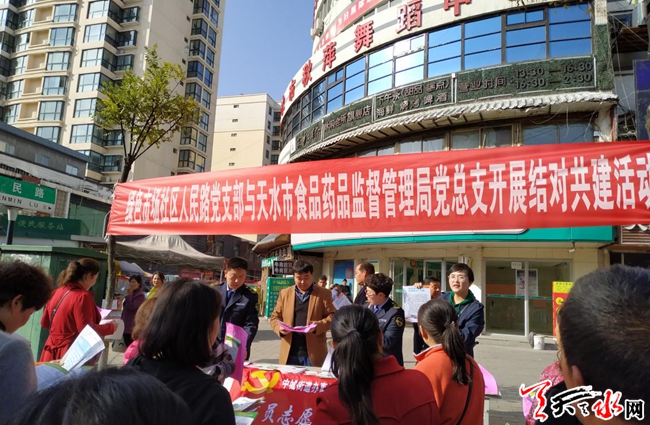 按照结对共建方案,人民路党支部和天水市食品药品监督管理局党总支党员设立宣传点,向居民及路人宣传食品药品安全知识,对居民群众关心的食品采购安全、转基因食品的常识、食品添加剂的安全知识等进行了讲解。