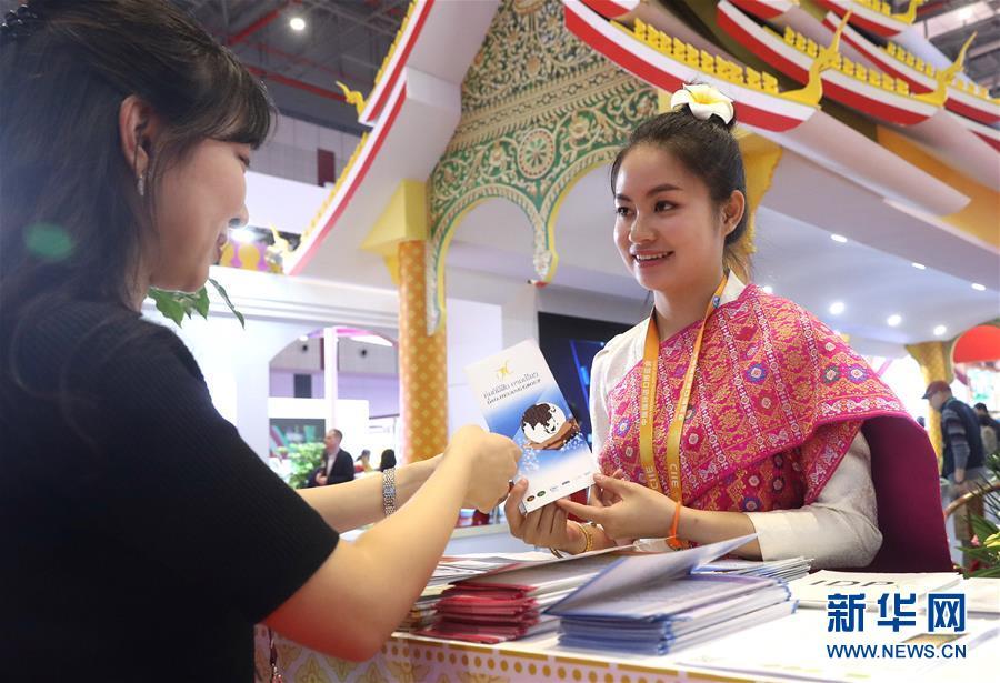 11月7日,在首届中国国际进口博览会上,老挝展区工作人员(右)在向参观者介绍情况。新华社记者 陈飞 摄