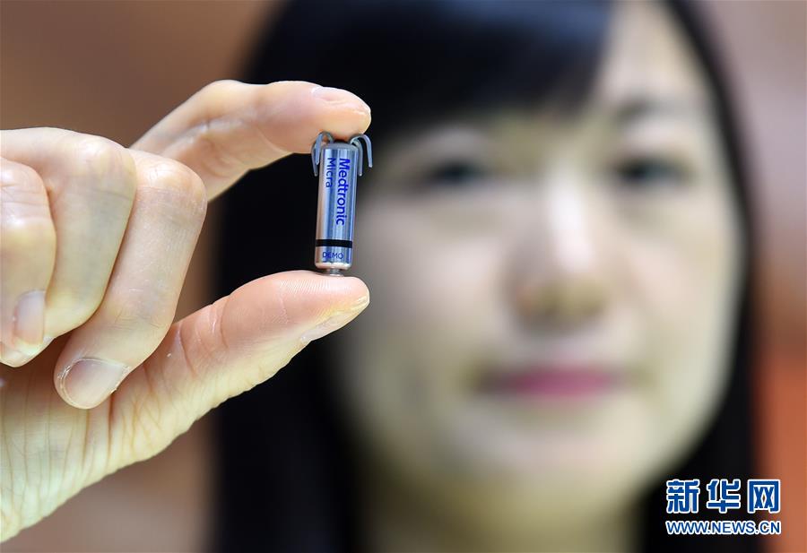 11月8日,在进博会医疗器械及医药保健展区美敦力公司展台,工作人员在展示全球最小的心脏起搏器。新华社记者 韩瑜庆 摄