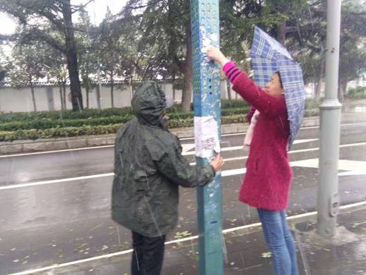 义务清扫队的队员认真的清理沿街小广告