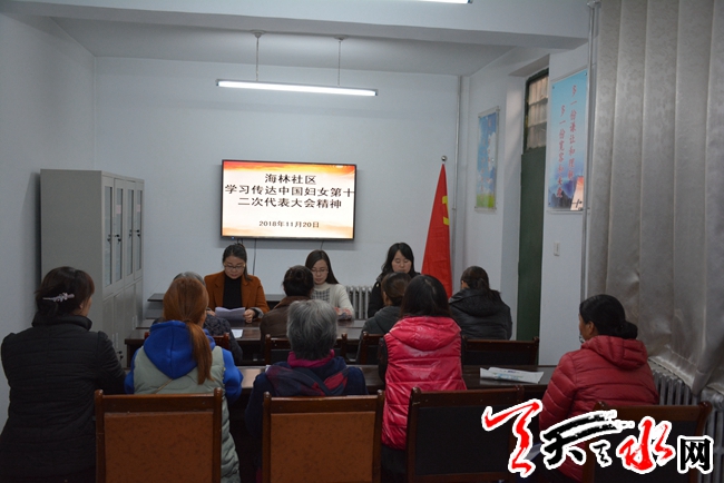 天天天水网讯【通讯员 胡春兰】11月20日下午,七里墩街道海林社区妇联组织辖区妇女代表学习传达了习近平总书记在同全国妇联新一届领导班子成员集体谈话时的重要讲话精神、赵乐际代表党中央所作的《在新时代征程中谱写半边天壮丽篇章》的致辞、全国妇联第十二届执行委员会第一次全体会议精神及中国妇女第十二次全国代表大会精神。