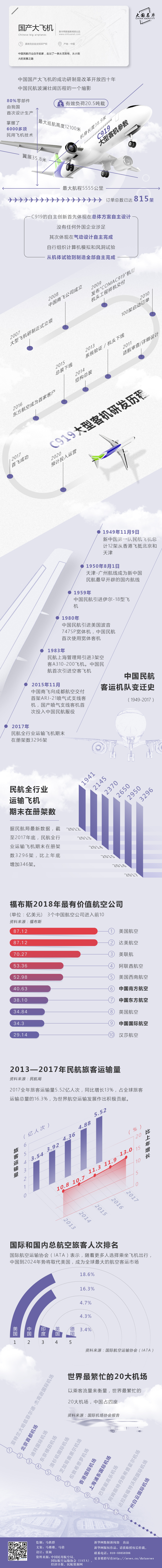 从建国初的12架飞机,到2017年底的3296架,从之前的单纯依靠国外进口,到自主研发的C919首飞成功。这些重大成就见证了我国民用航空自主创新的奋进历程,成为中国民航转型升级、迈向中高端的生动缩影。