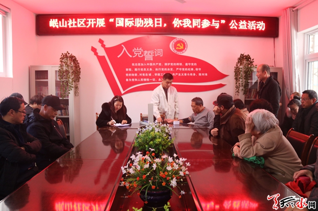 天天天水网讯(通讯员 梁兰英)在第27个国际残疾人日来临之际,秦州区岷山社区联合社区卫生服务中心蔡大夫于11月30日在社区举办了以“国际助残日,你我同参与”为主题的爱心公益活动。