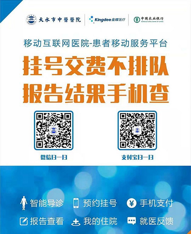 该平台需患者在微信中通过搜索“天水市中医医院服务号”进行关注或扫描“天水市中医医院微信公众服务号”二维码进行关注;也可以在支付宝中扫描“天水市中医医院支付宝生活号”二维码进行关注。关注成功后,输入就诊人姓名、身份证号及手机号进行绑定,随后即可接受预约挂号以及各项线上移动医疗服务。完成挂号后,即可看到患者就诊序号,也可实时在挂号平台查询排队情况。门诊缴费再也不用楼上楼下反复奔波,通过医生电脑开单,患者使用微信或支付宝在手机上秒秒钟便可以完成缴费流程。未通过关注“天水市中医医院微信公众服务号”和“天水市中医医院支付宝生活号”就诊的患者亦可到各楼层收费窗口扫描微信或者支付宝完成缴费。同时,每日的住院消费清单也可以在手机上查看。