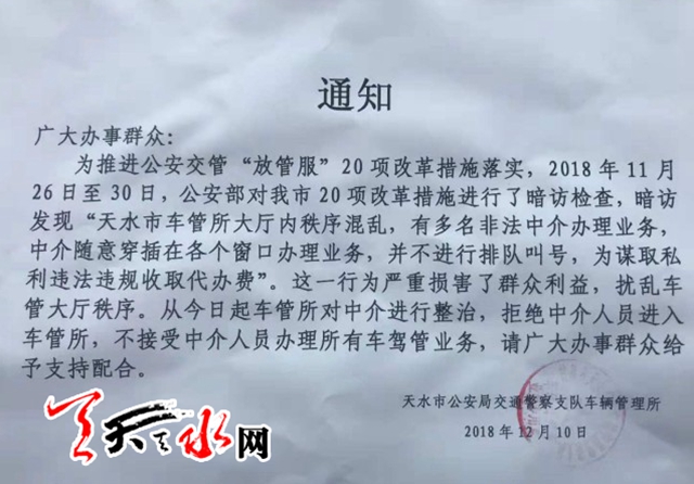 10日起,天水市车管所拒绝中介人员进入