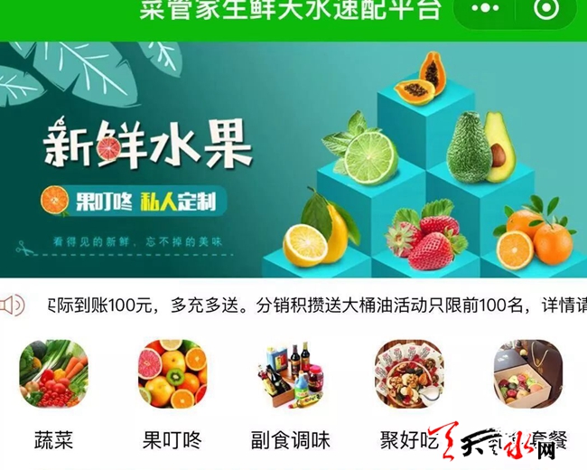 12月10日上午,秦州区的程女士经朋友介绍,加入了一个名为“天水市菜管家果蔬米面油配送群”的群聊,其中有群友300多人,而且不断有人在加入,群里推送的菜管家小程序中售卖着各种蔬菜、水果、副食调味品等商品。程女士随机购买了几种家里需要的菜品。“提交订单付款后1.5个小时便接到送货员的电话,新鲜的蔬菜就直接送到家里了。”程女士高兴地告诉记者,最近天气特别冷,一下班就想回到家里暖着,这个速配平台解决了去菜市场买菜的烦恼。
