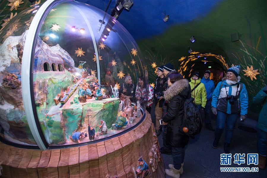 几名中国游客在瑞士中部伯尔尼州因特拉肯地区的少女峰景区超级冰宫内游览(2017年12月7日摄)。新华社记者徐金泉摄