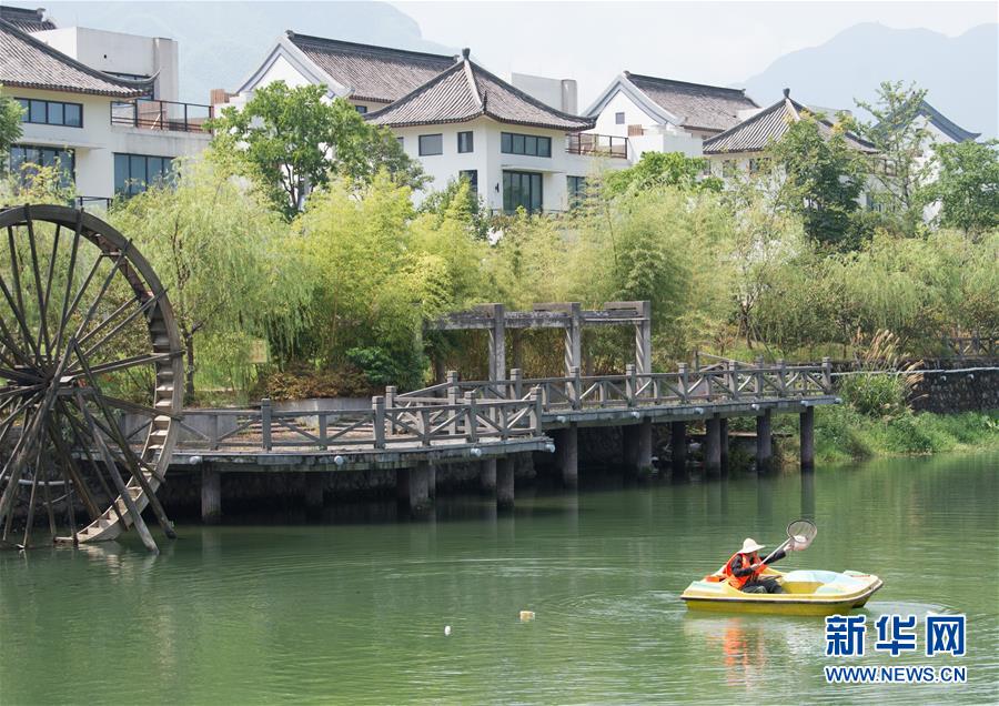 物业公司的工作人员在安吉县天荒坪镇余村进行河道清洁(2017年8月4日摄)。自2010年起,浙江省安吉县开始探索将物业公司引入农村,对村庄保洁、河道清洁、绿化养护、文体设施维护进行专业管理。新华社记者 翁忻旸 摄