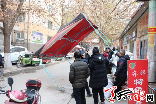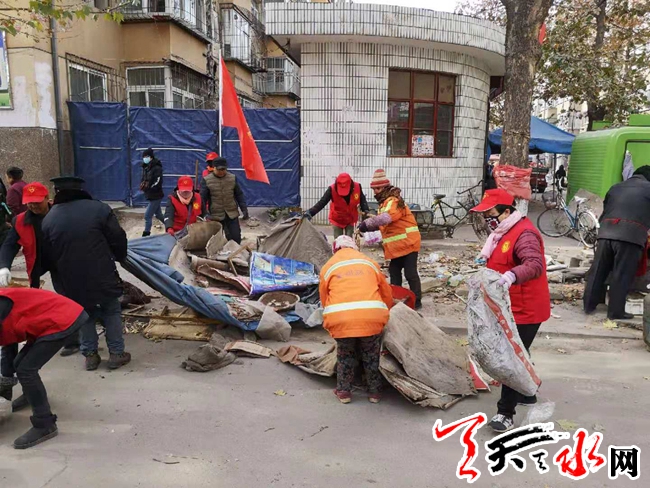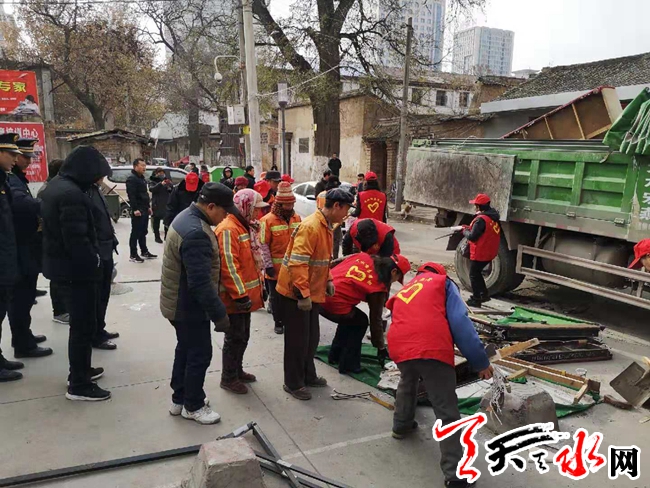 为了落实秦州区人民政府关于开展城区背街小巷老旧小区环境卫生综合整治工作会议精神,2018年12月7日早上,东关街道领导班子现场指挥,交警、工商、综合执法、派出所、食药监、环卫等部门联合执法,在忠武巷社区20多位志愿者的齐心配合下,清理乱停车辆和僵尸车30多辆,拆除私搭乱建遮阳棚、破旧门头10多个,取缔占道经营小摊点18家,整顿沿街铺面倚门经商乱象,清扫垃圾死角,清洗乱贴乱画。整治力度之大,充分显示了街道党委、办事处开展城区背街小巷老旧小区环境卫生综合整治的决心、信心。