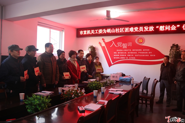 岷山社区党委书记何萍介绍了社区工作的基本情况,随后,市直机关工委雒书记亲切地和困难党员面对面交谈,了解了社区居民党员的思想情况和生活现状,并且为岷山社区杨军等五户困难党员分别发放了1000元的“慰问金”,不仅从思想、生活和物质上给予了关怀,而且让他们深切体会到党和社会对他们的关怀与温暖。通过这次结对共建,逐步形成”资源共享、共创共建、优势互补”的社区党建新格局。