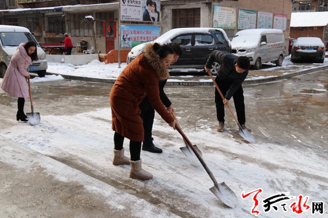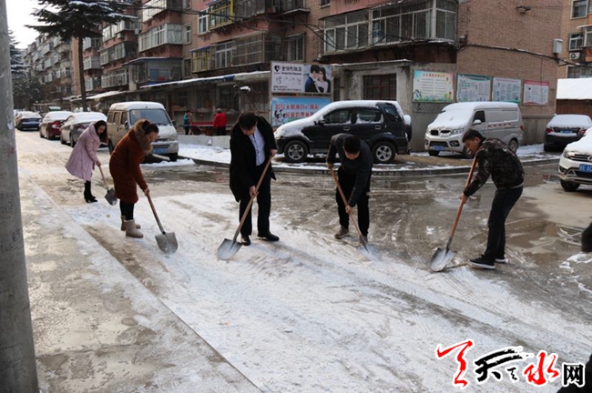 天天天水网讯【通讯员 于亚江】12月28日下午,秦州区七里墩街道海林社区组织社区干部和党员志愿者开展铲雪扫雪活动。这场雪给广大市民带来惊喜和兴奋的同时,也给道路交通、群众生活、人们的出行带来了诸多不便,为及时清除积雪,确保交通安全和群众出行方便,志愿者们带上铁锹和扫把就忙碌起来,开始义务扫雪活动。