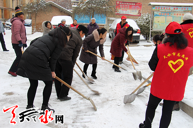 天天天水网讯(通讯员吴娟)12月27日我市普降大雪,部分路面也开始结冰,给居民们的活动带来很大的不便和安全隐患,为了方便居民来社区办事,保证大家安全出行,12月28日一大早,王家磨社区结合市文明办“创建全国文明城,在职党员先锋行”志愿服务主题活动,组织在职党员、居民志愿者50余人带上铁锹忙碌了起来,开始义务扫雪活动。大家躬着身子,握着扫把、铁锹、除雪铲,一铲一扫地把雪扫到了路两旁,全力清理社区主要干道上的积雪。不到一个小时,在大家的共同努力下,小区内的路面积雪就被清理干净,为居民创造了安全的通行环境。