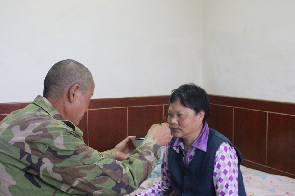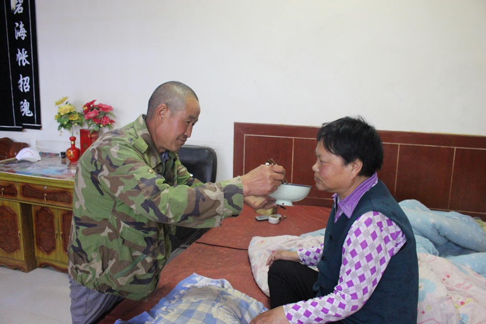 90年初,陈润明入赘到丧夫不久的褚巧梅家中,瘦弱的他扛起了这个破碎家庭的重担,一扛就是20余年,3个和他没有血缘关系的孩子在他的照顾下读书、成长,一个原本羸弱的家在他的经营下,开始变得有希望,有生机。然而,天有不测风云,2000年,体弱的的褚巧梅突然变得精神异常,行动不变,生活不能自理,这对于陈润明来说无异于天塌了下来。当时最大的孩子12岁,最小的孩子10岁,3个尚在读书的孩子,家中10余亩的耕地,而今又多了一个生活不能自理,需要日日呵护陪伴的爱人,面对这一切的困难,陈润明没有倒下,他以瘦弱的肩膀扛起了这个家所有的磨难,也扛起了这个家所有的希望。从2000年至今,陈润明每天都是早起为妻子褚巧梅洗脸、擦身,然后去厨房为三个孩子和几患病的妻子做好早饭,送孩子们去学校后,安顿好卧病在床的妻子,忙完家里的一切,又开始收拾农具,去地里劳作。十八年的光阴,弹指一挥间,十八年的呵护,却印满了苦涩与坚守。相濡以沫,不离不弃,每天看着妻子吃饭是陈润明最开心的事。看着妻子一天天好转,从卧床不起,到现在妻子可以自己吃饭,这一切的付出,润明乐在心里,笑在脸上。如今,两个女儿已经出嫁,儿子也可以自食其力,这对于润明来说身上的担子总算轻了一点。但是,今后的路还很长,妻子褚巧梅病情时好时坏,每年都需要住院两三次治疗,每天都需要端水送饭。一边是需要照料的爱人,一边是家中刚刚培育起来的产业,这两副担子还得他来扛。日渐伛偻的陈润明并没有倒下,照顾妻子、务好庄稼都是他的责任,他说,“这条路虽然长,但有爱,不会觉得累”。