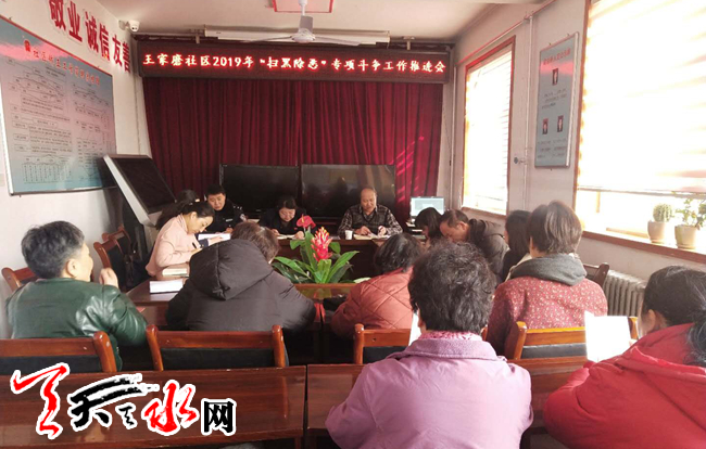 天天天水网讯(通讯员吴娟)2月21日下午,天水郡街道王家磨社区召开了“扫黑除恶”专项斗争工作推进会,街道包社区领导、人大工委主任补天军,社区干部、大党委成员单位领导、派出所民警、居民小组长共20余人参加了会议。