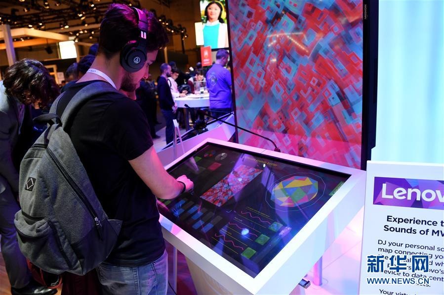 参观者在西班牙巴塞罗那举行的世界移动通信大会上体验联想集团推出的触屏版个人DJ系统(2018年3月1日摄)。新华社记者 郭求达 摄
