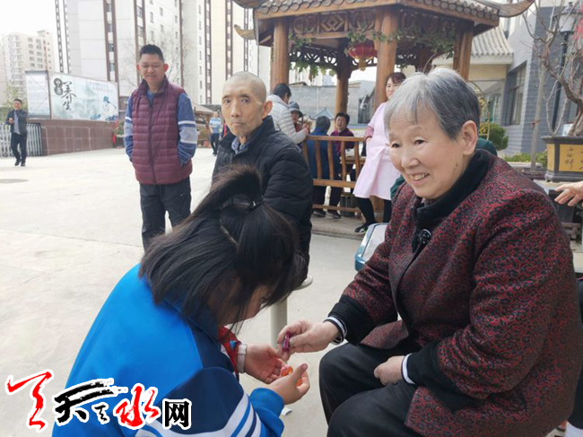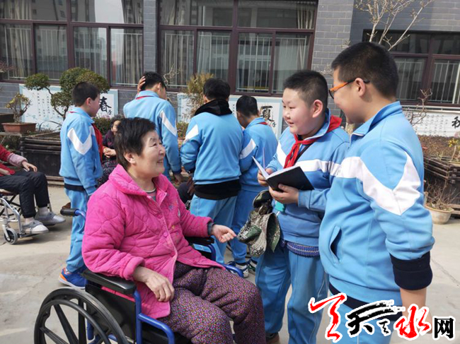 3月5日“学雷锋纪念日”,秦州区安宁小学教师、学生一行36人前往秦州区老年护理院开展“学雷锋 献爱心”实践活动。孩子们陪老人聊天,为老人们打扫居住环境,并观看了老年护理院的日常生活短片,在了解了老人们的生活状况和困难后,孩子们纷纷表示要常来看望这里的老人,为他们提供力所能及的帮助。