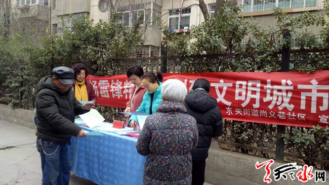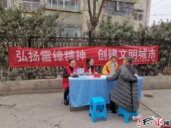 天天天水网讯【通讯员余芳】三月是一个春光明媚、生机勃勃的季节,三月更是一个讲文明、树新风的节日,为进一步弘扬雷锋精神,营造志愿服务良好氛围,东关街道尚义巷社区党委以“3.5学雷锋日”为契机开展“主题党日”活动,携手社区计生协会组织社区志愿者于3月2日至3月5日在辖区内开展了“弘扬雷锋精神,创建文明城市”志愿服务系列活动。
